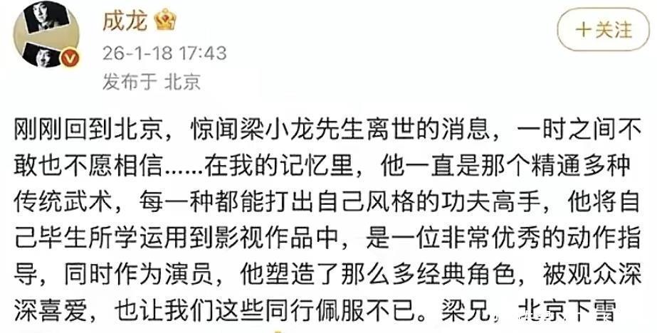 两个月前他跟梁小龙在本地一家老茶馆见面,老人家是被徒弟搀着进门的,走路都打晃,整个人瘦得跟竹竿似的,脸色苍白得吓人。俩人坐下没聊一会儿,梁小龙就困得眼睛都睁不开,打哈欠一个接一个。手机倒是响个不停,这边商演邀约催着回复,那边直播团队催着确认节目流程,第二天天不亮就得坐车去乡下搞活动。成龙在社交平台发了段文字,说梁小龙是他一直敬重的功夫前辈。