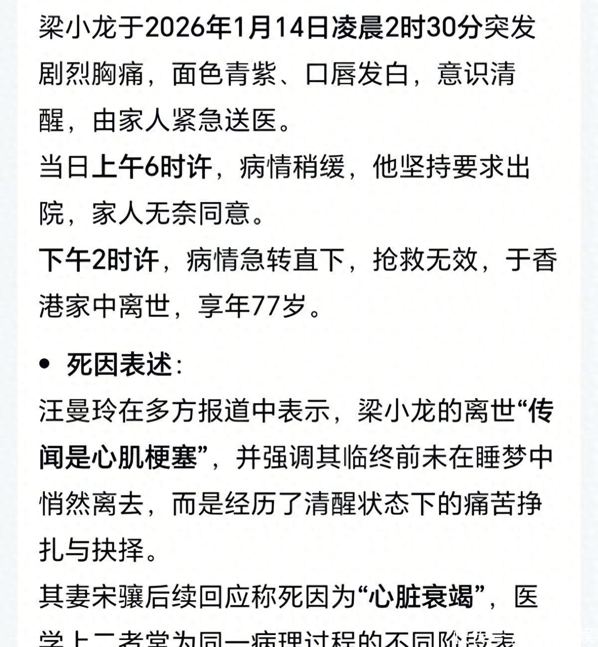 深圳一家医院的急救室外,1月14号下午从4点守到晚上10点,梁小龙的几个徒弟最后还是没能等来好消息。75岁的老人家心脏彻底停了跳,医生判定为心脏衰竭。
